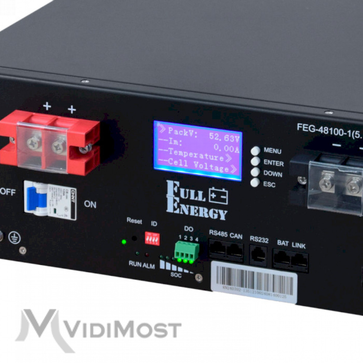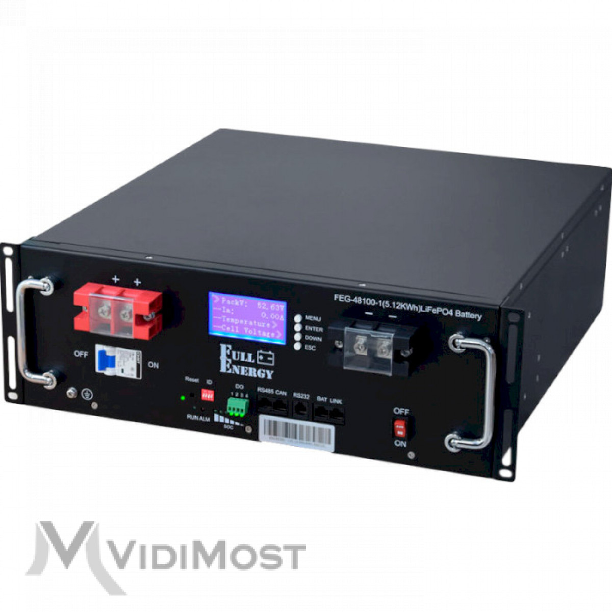 Літій-залізо-фосфатний акумулятор FEG-48100-1 виконаний у герметичному корпусі та виготовлений за технологією LiFePO4. У технології використовується мінерал сімейства олівін – він зустрічається у природному середовищі, не токсичний, термостійкий. Місткість - 100 A•год / 5120 Вт•год. Напруга – 48 В. Порти: CAN, RS485, розміри: 480х542х155мм. Вбудований LCD екран із зазначенням рівня заряду акумулятора.