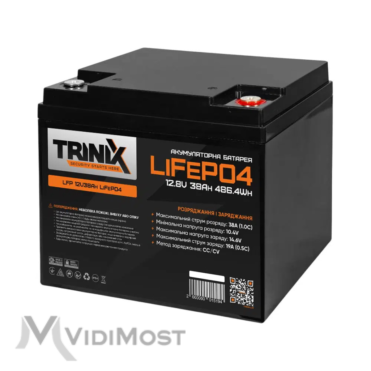 TRINIX LFP 12V38Ah LiFePO4 — літій-залізо-фосфатна акумуляторна батарея з номінальною напругою 12.8 В та ємністю 38 А·год, призначена для систем резервного живлення, відеоспостереження, сигналізації, UPS та телекомунікаційного обладнання.