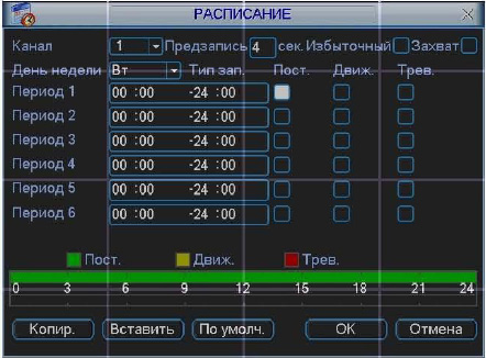 Данная функция позволяет копировать и применять настройки одного канала для другого. Для этого, установив настройки для канала 1, нажмите клавишу Копир., выберите из выпадающего списка каналов канал 2, 3, 4 или все и нажмите клавишу Вставить. После настройки расписания каждого канала необходимо нажимать кнопку Сохранить для записи параметров.