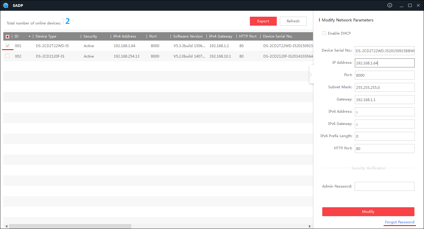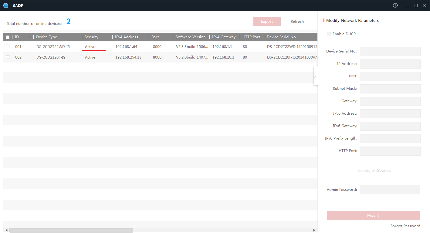 4. Когда ПК и устройство подключены напрямую и IPадрес ПК изменился в то время, как SADP была открыта, просто перезапустите SADP