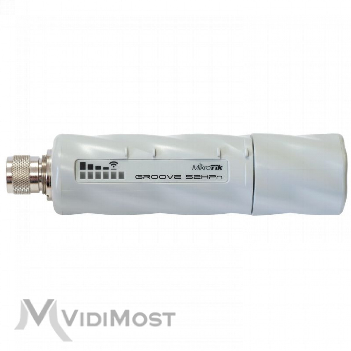 Groove A-52HPn від Mikrotik - компактна AP зовнішнього застосування. Передавач працює (не одночасно) в двох діапазонах - 2 ГГц та 5 ГГц (ширина каналу 20 / 40MHz), потрібна частота роботи вибирається програмно. Потужність - 27dBm (500mW). Працює в стандартах 802.11 a / b / g / n. Реальна пропускна здатність становить 125 Мбіт / c. У комплекті йде всенаправленная антена 6 dBi. Також є порт Fast Ethernet з пропускною спроможністю 10/100 Мбіт / с, який грає роль входу пасивного РоE. Вхідна напруга на РоЕ-in має перебувати в межах від 9В до 30В. Максимальне споживання електроенергії не перевищує 6Вт. Для зручності експлуатації передбачена кнопка скидання, монітор напруги і температура плати. У комплект поставки точки доступу MikroTik GrooveA 52 (RBGrooveA-52HPn), крім самого пристрою, також входять інжектор РоЕ, монтажні петлі і адаптер живлення 24В / 0,19А.