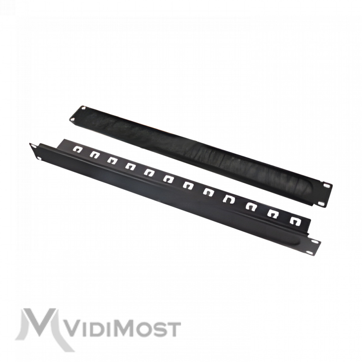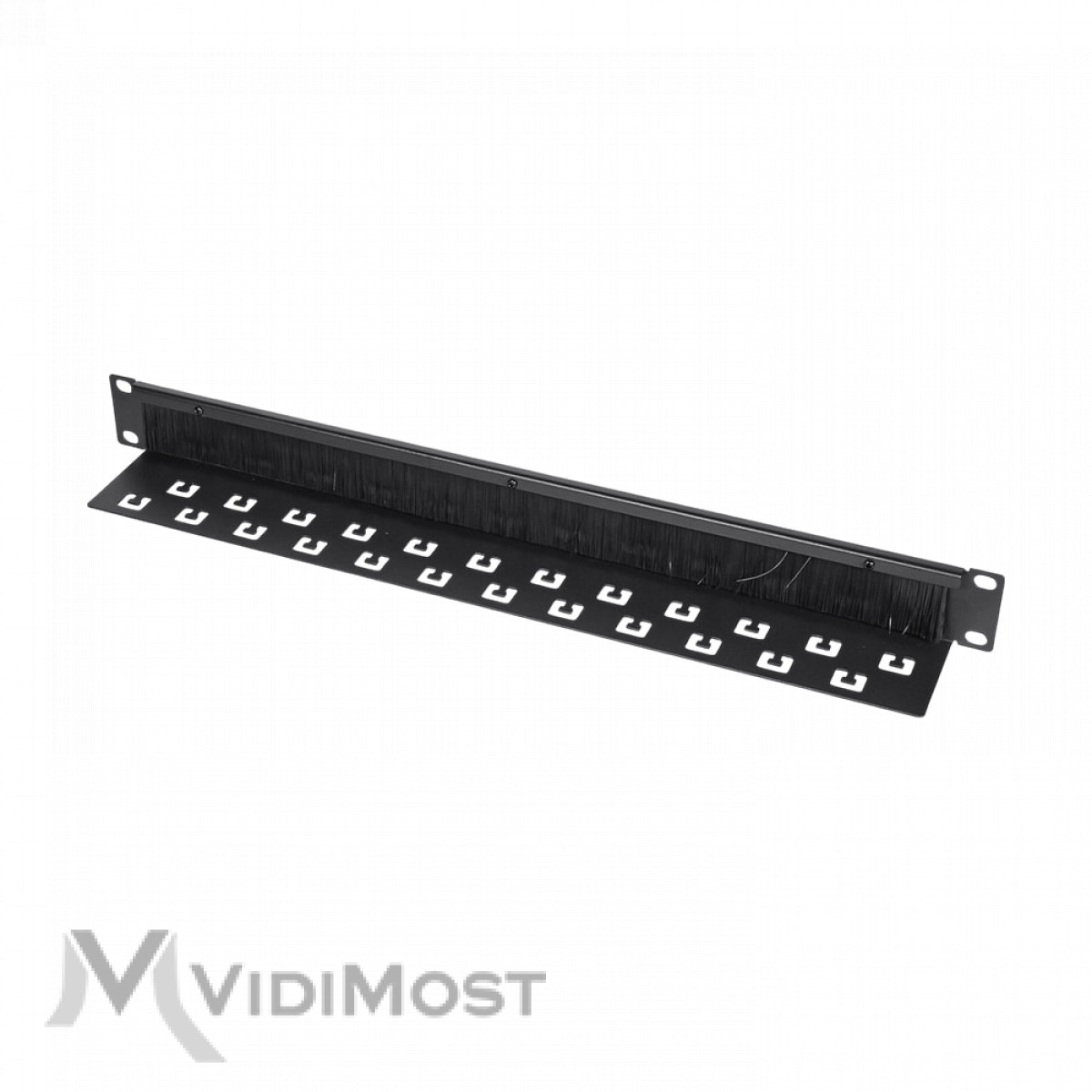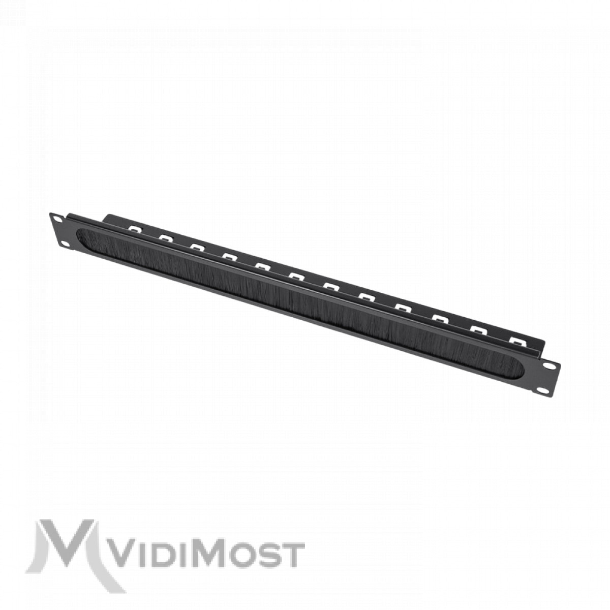 Корпус організатора виготовлений із міцної сталі з порошковим фарбуванням чорного кольору, що забезпечує довговічність і стійкість до механічних впливів. Центральна частина оснащена щільною нейлоновою щіткою, через яку зручно проводити кабелі, не допускаючи потрапляння пилу всередину шафи.