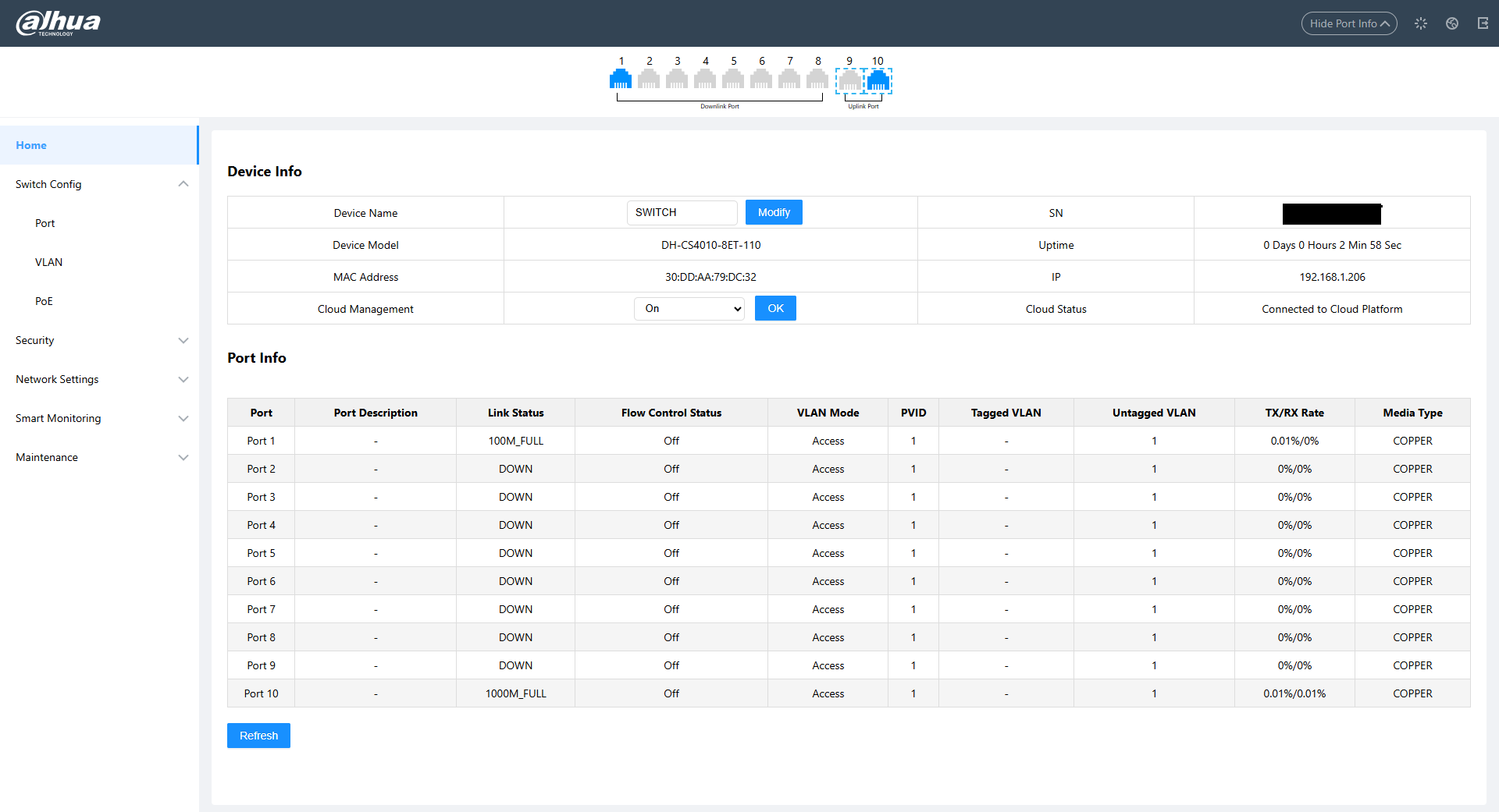 DH-CS4010-8ET-110 — 10-портовий керований PoE-комутатор з потужністю 110 Вт, ідеальний для середніх інсталяцій, підтримує VLAN та QoS.