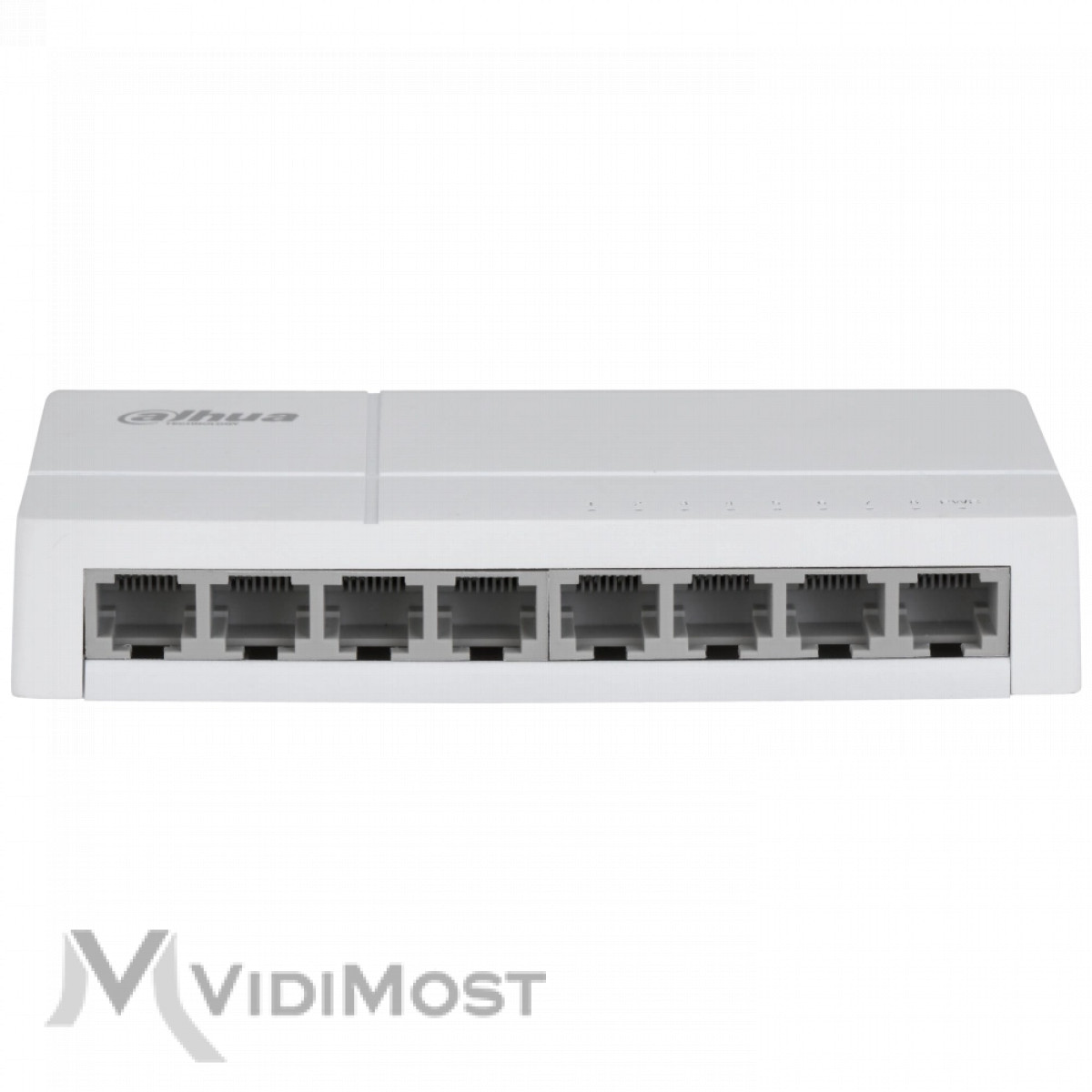 DH-SF1008L - некерований комутатор на 8 портів 10/100 Base-Т. Виконаний з якісних матеріалів в корпусі білого кольору. Має зовнішній блок живлення, грозозахист та невеликі розміри, що підвищує практичність даного комутатора. Комутатор оснащений 8 портами 100 Мбіт / с з автопогодженням і роз'ємами RJ45. Всі порти підтримують функцію авто-MDI / MDIX, усуваючи необхідність використання кабелю з перехресними парами або портів з підтримкою функції Uplink.