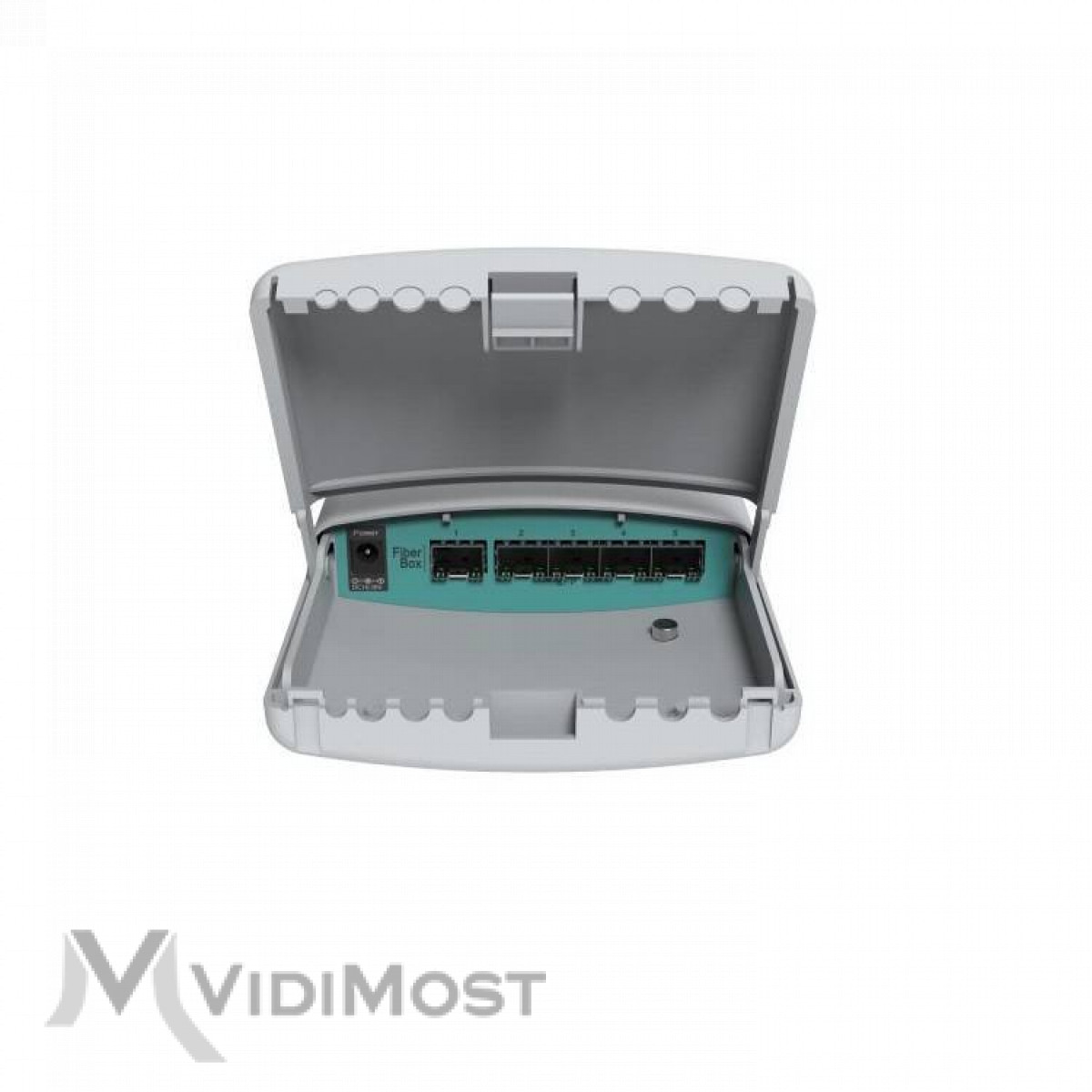 MikroTik Fiberbox – це комутатор із п'ятьма оптичними гігабітними інтерфейсами для використання поза приміщеннями. Пристрій вбудований у герметичний корпус, що захищає його компоненти від атмосферних впливів.