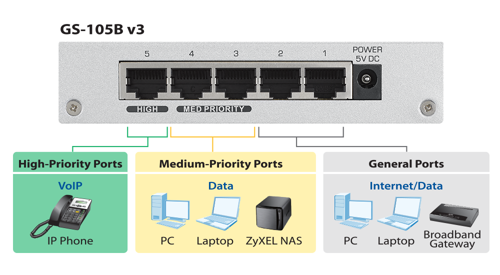 GS-105B v3 обладнаний 3 портами QoS з вбудованим механізмом high-priority і medium-priority для стабільної роботи VoIP та обміну даними. Якщо приєднати до цих портів IP-телефон, комп'ютер або мережеве сховище, то ви отримаєте високу якість зв'язку VoIP та обміну даними.