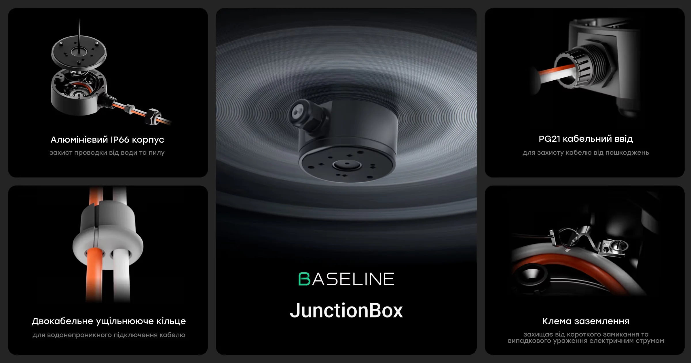 JunctionBox — це водонепроникна алюмінієва монтажна коробка для надійного прокладання кабелів до IP-камер відеоспостереження Ajax. Вона легко встановлюється на бетонні стіни, стелі та колони як у приміщеннях, так і надворі. Кожна деталь коробки продумана до дрібниць, що гарантує надійну й тривалу експлуатацію.