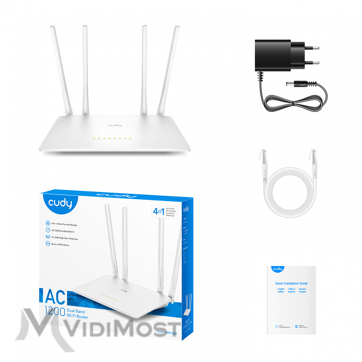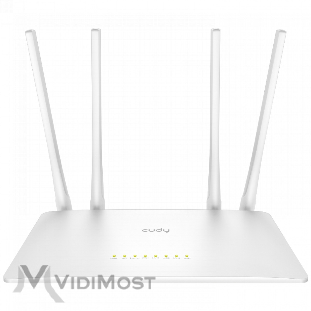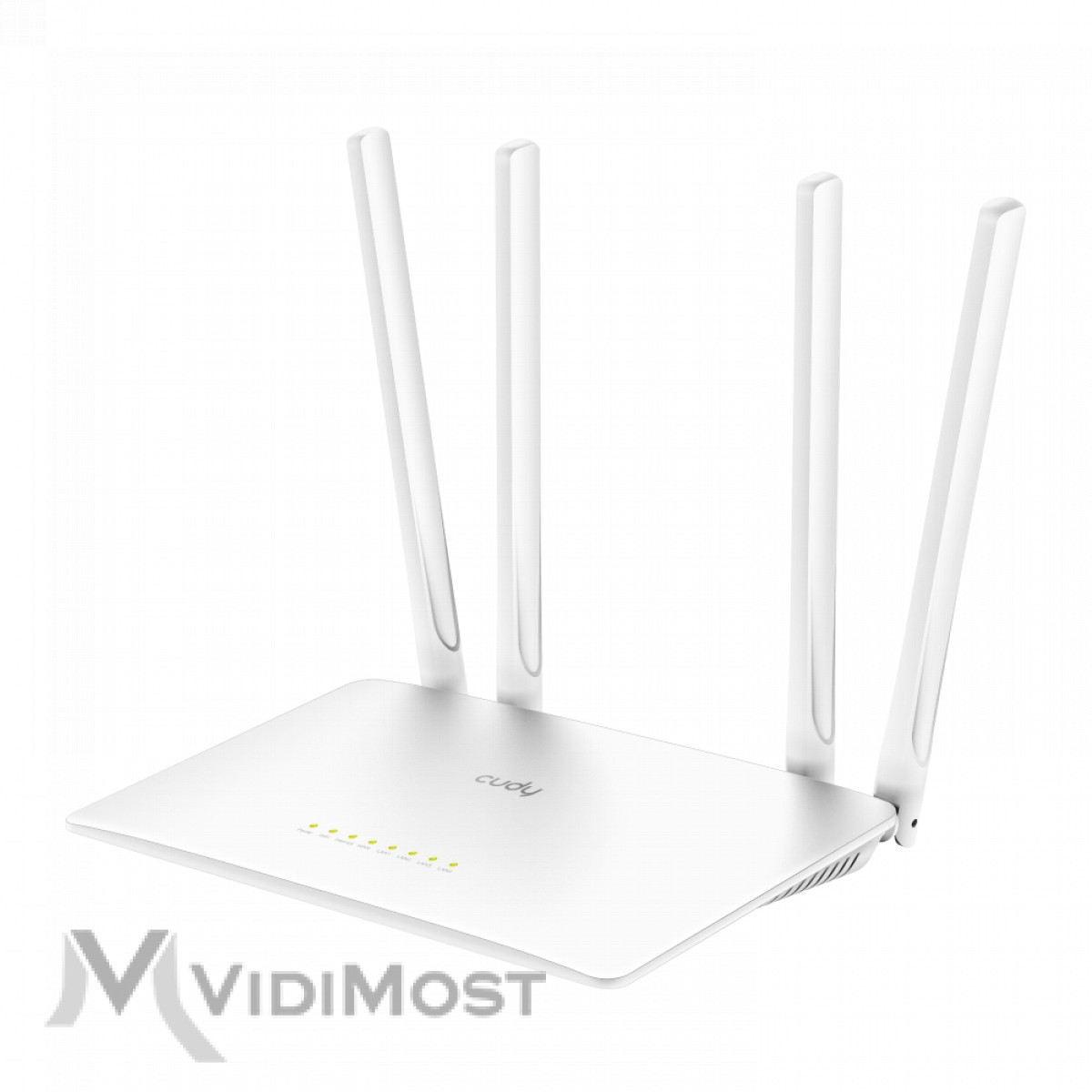 Дводіапазонний WiFi 5 маршрутизатор Cudy WR1200. Швидкість передачі 867 Мбіт/с на 5 ГГц + 300 Мбіт/с на 2.4 ГГц, стандарт WiFi 802.11ac/a/b/g/n, 5 портів Ethernet 10/100 Мбіт/с, 4 зовнішні антени 5dBi.