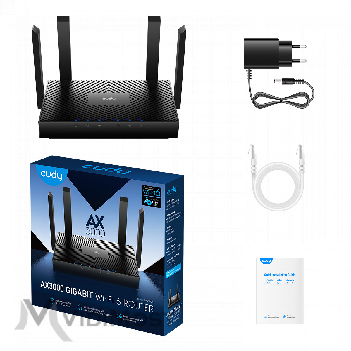 Гігабітний дводіапазонний WiFi 6 Mesh-маршрутизатор Cudy WR3000. Швидкість передачі 2402 Мбіт/с на 5 ГГц + 574 Мбіт/с на 2.4 ГГц, стандарт WiFi 802.11ax/ac/a/b/g/n, 4 гігабітні порти Ethernet, 4 зовнішні антени 5dBi.