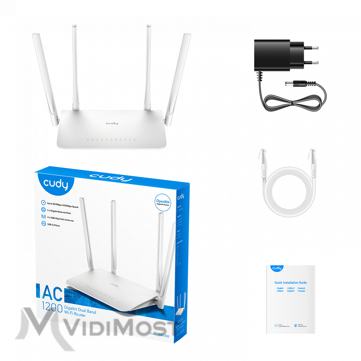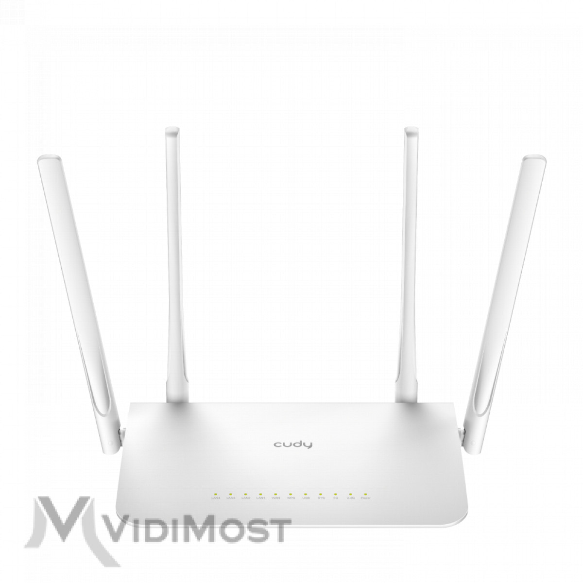 Гігабітний дводіапазонний WiFi 5 Mesh-маршрутизатор Cudy WR1300. Швидкість передачі 867 Мбіт/с на 5 ГГц + 300 Мбіт/с на 2.4 ГГц, стандарт WiFi 802.11ac/a/b/g/n, 5 гігабітних портів Ethernet, 4 зовнішні антени 5dBi.