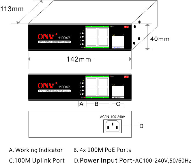 Комутатор ONV-H1004P забезпечує передачу даних і електроживлення від вузла мережі через Cat.5 кабель. Він оснащений 5-ю портами зі швидкістю передачі 10 / 100Mbps, 4 порти можуть передавати електроенергію по стандарту IEEE802.3af. Функція автоаналізу дозволяє подавати електрику тільки на пристрої з підтримкою PoE (стандарт IEEE802.3af), тому до нього можна в разі необхідності підключати і пристрої без PoE, вони не постраждають. Також, якщо пристрій PoE відключено, комутатор припинить подачу живлення на нього.
