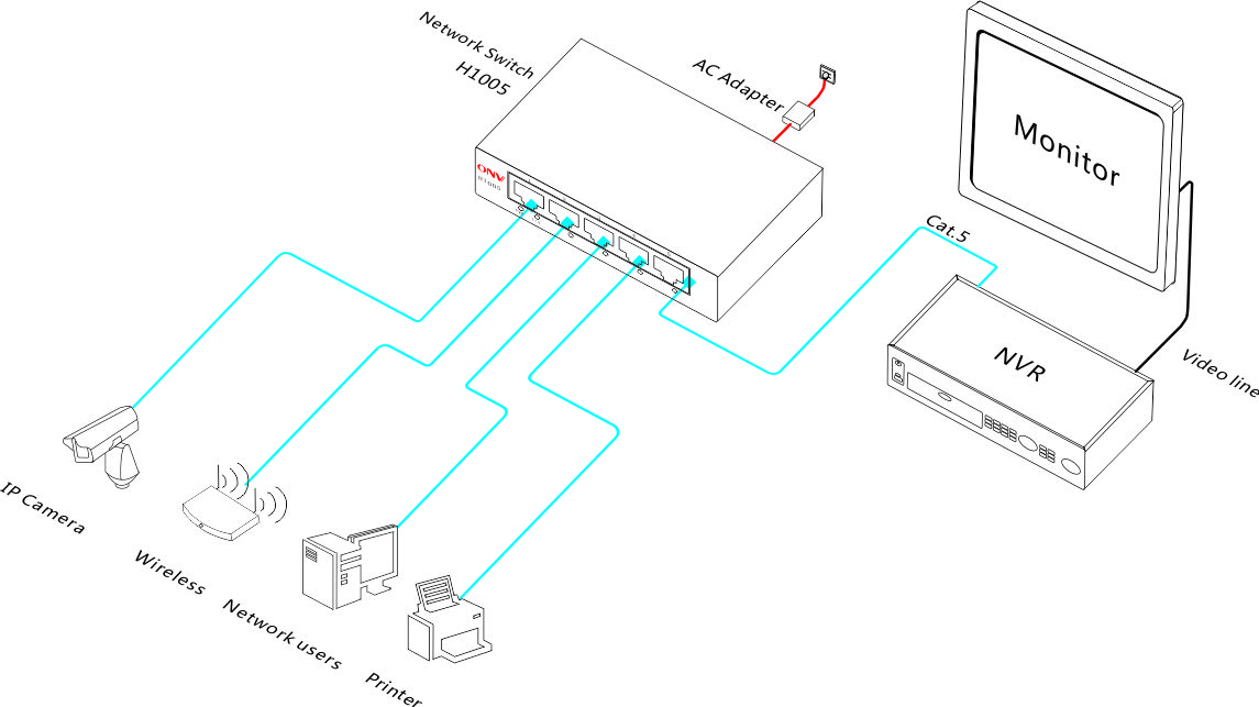 ONV-H1005 спроектований як мережевий комутатор відеоспостереження для невеликої відеомережі в будинку або в офісі. Швидкість передачі даних в повнодуплкесному режимі - до 200Mб. Автоматична ідентифікація паралельних і перехресних ліній. Технологія Plug and play значно спрощує установку і настройку пристрою.