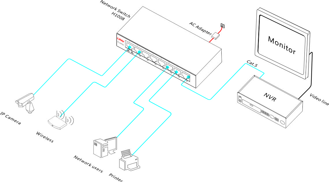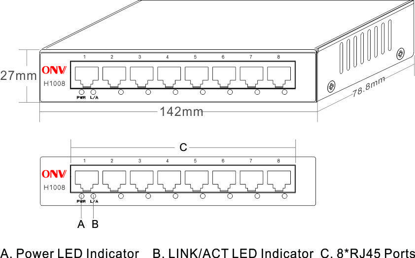 ONV-H1008 спроектований як мережевий комутатор для невеликої мережі відеоспостереження, в будинку або в офісі. Швидкість передачі даних в повнодуплкесному режимі - до 200Mб. Автоматична ідентифікація паралельних і перехресних ліній. Технологія Plug and play значно спрощує установку і настройку пристрою.