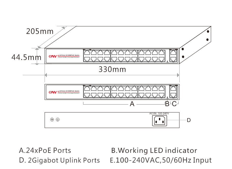 Цей комутатор призначений для передачі електро живлення і даних. Всі 24 PoE порту можуть бути підключені 10 / 100Mб. Завдяки розширеному алгоритму автоаналіза немає необхідності турбуватися про пошкодження обладнання без PoE, комутатор не подаватиме електрику на такі пристрої. Крім того, він відключить живлення якщо пристрої PoE не підключені. Комутатор використовує режим Store and Forward - читає всю інформацію в кадрі, перевіряє його на відсутність помилок, вибирає порт комутації і тільки після цього посилає в нього кадр. Це найбільш надійний режим комутації. Охолодження відбувається природним шляхом, без вентилятора. Це значно знижує шум при роботі пристрою і дозволяє встановлювати його в офісі або в інших робочих приміщеннях. Живлення - з мережевого кабелю від мережі 220В, блок живлення вмонтований.