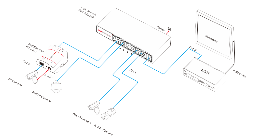 - Може працювати з мережевих камер спостереження без функції PoE в режимі звичайного свічу