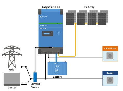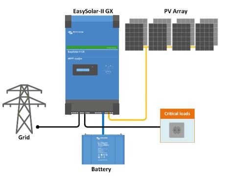 EasySolar-II GX буде використовувати надмірну PV-енергію для заряджання батарей або подачі живлення назад у мережу, і буде розряджати батарею або використовувати живлення від мережі при нестачі PV-потужності. У разі зникнення живлення в мережі EasySolar-II GX відключиться від мережі та продовжить живлення навантажень. Навантаження, які повинні відключатися за відсутності живлення змінного струму, можуть бути підключені до другого виходу (не показано). Ці навантаження будуть враховуватися функціями PowerControl та PowerAssist, щоб обмежити вхідний змінний струм безпечним значенням.