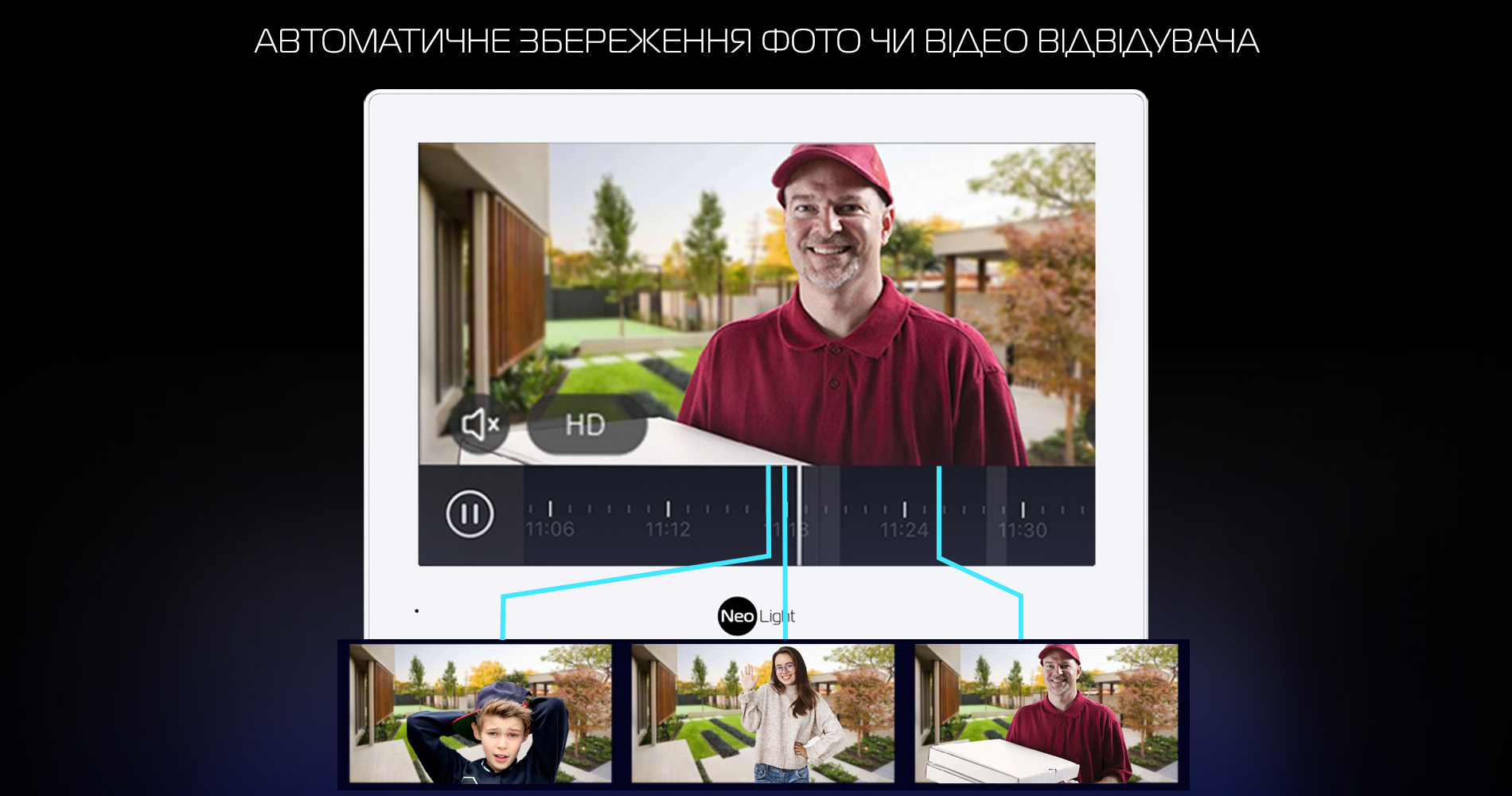 відеовиклик, спілкування, віддалене відкриття замку/воріт, перегляд камер, архіву та ін. за допомогою мобільного додатку "NeoLight";