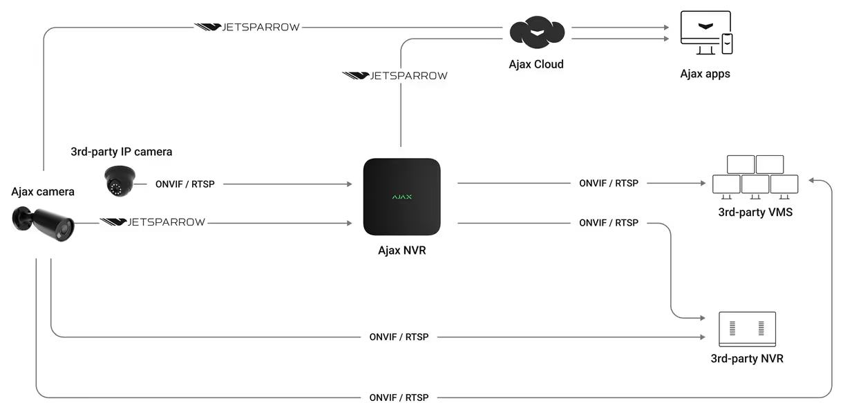 Відеопристрої Ajax підтримують протоколи ONVIF і RTSP — без особливих хитрощів і зайвих зусиль. Це відкриває численні можливості для модернізації та реновації наявних відеосистем розширеними охоронними функціями. Камери та мережеві відеореєстратори Ajax додаються до сторонніх систем відеоспостереження чи VMS у кілька дотиків. Особливий майстер налаштування в застосунках Ajax бере на себе рутинні завдання, автоматично підставляючи всі необхідні дані мережі. Плавний відеопотік, гнучке налаштування зображення й повна свобода конфігурації — усі ці можливості відкриває Ajax для нових чи наявних систем. Створюйте рішення, що ідеально відповідають вашим потребам.